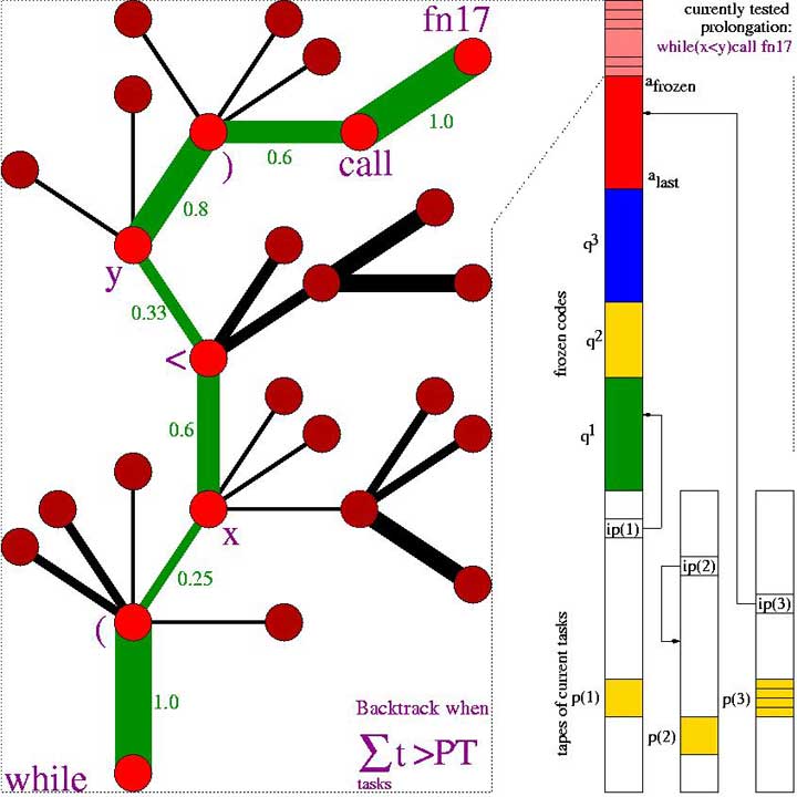 Search tree during an OOPS application. The tree branches are program prefixes. A single prefix may modify several task-specific tapes in parallel. Nodes represent primitive instructions; widths of connections between nodes stand for temporary, task-specific transition probabilities encoded (yellow) on the modifiable computation tapes (white, to the right; one tape per task; each tape has an instruction pointer). Prefixes may contain (or call previously frozen) subprograms that dynamically modify the conditional probabilities during runtime, thus rewriting the suffix search procedure. In the example, the currently tested prefix (pink, above the previously frozen codes) consists of the token sequence "while (x /< y) call fn17" (real values in the tree denote transition probabilities). Here fn17 might be a time-consuming instruction, say, for manipulating the arm of a realistic virtual robot. Before requesting an additional token, this prefix may run for a long time, thus changing many components of numerous tapes. Node-oriented backtracking will restore partially solved task sets and modifications of internal states and continuation probabilities once there is an error or the sum of the runtimes of the current prefix on all current tasks exceeds the prefix probability multiplied multiplied by the current search time limit, which keeps doubling until the current task set is solved.
